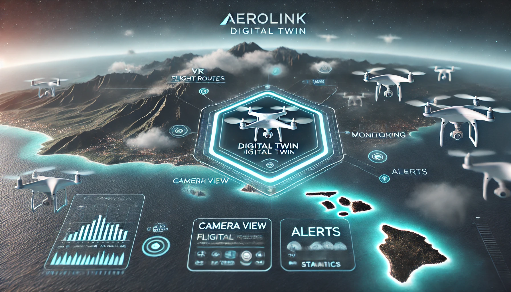 AeroLink is a Digital Twin technology in VR that creates a real-time simulation of drone operations. It provides an interactive 3D model of real-world locations, where users can track, manage and optimize drone missions. In the Hawaii use case, the entire environment—terrain, launch stations and drones—is mirrored as a Digital Twin, enabling advanced applications in search & rescue, logistics and environmental monitoring.
